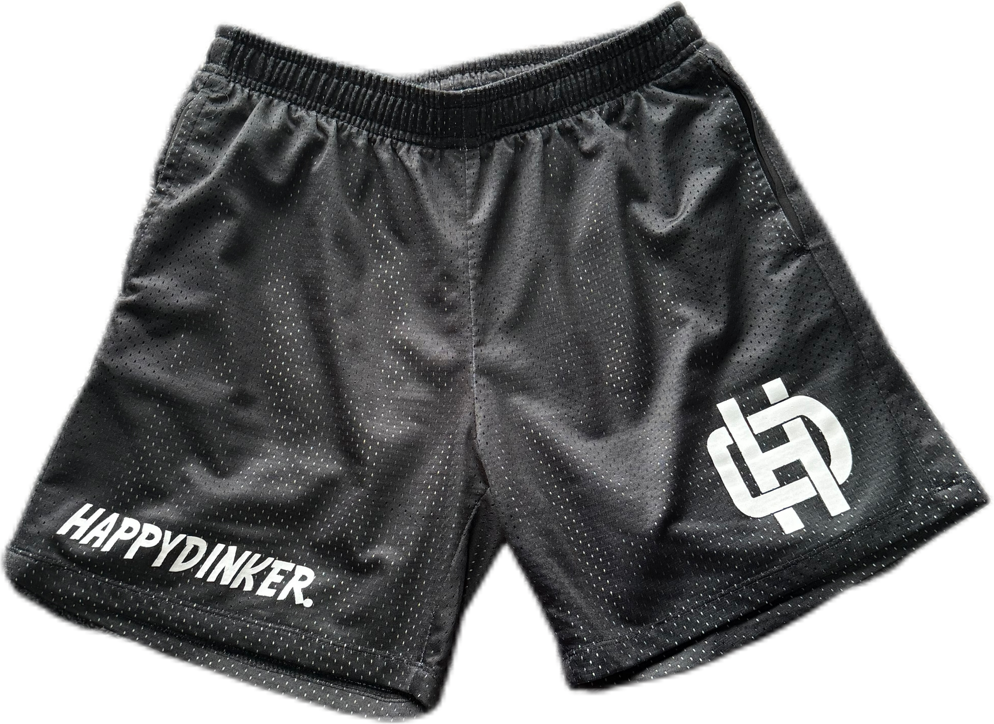 The HappyDinker Mesh Shorts V1 in black blend function, style, and meaning—perfect for representing the HappyDinker community while staying comfortable and cool, whether you're dominating the pickleball court or hanging out with the crew.